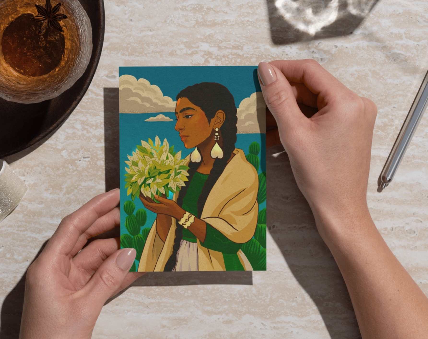 In this portrait, the flor de maracuyá represents strength rooted in tradition and the courage to stand firm, much like the women who carry stories of resilience across generations.